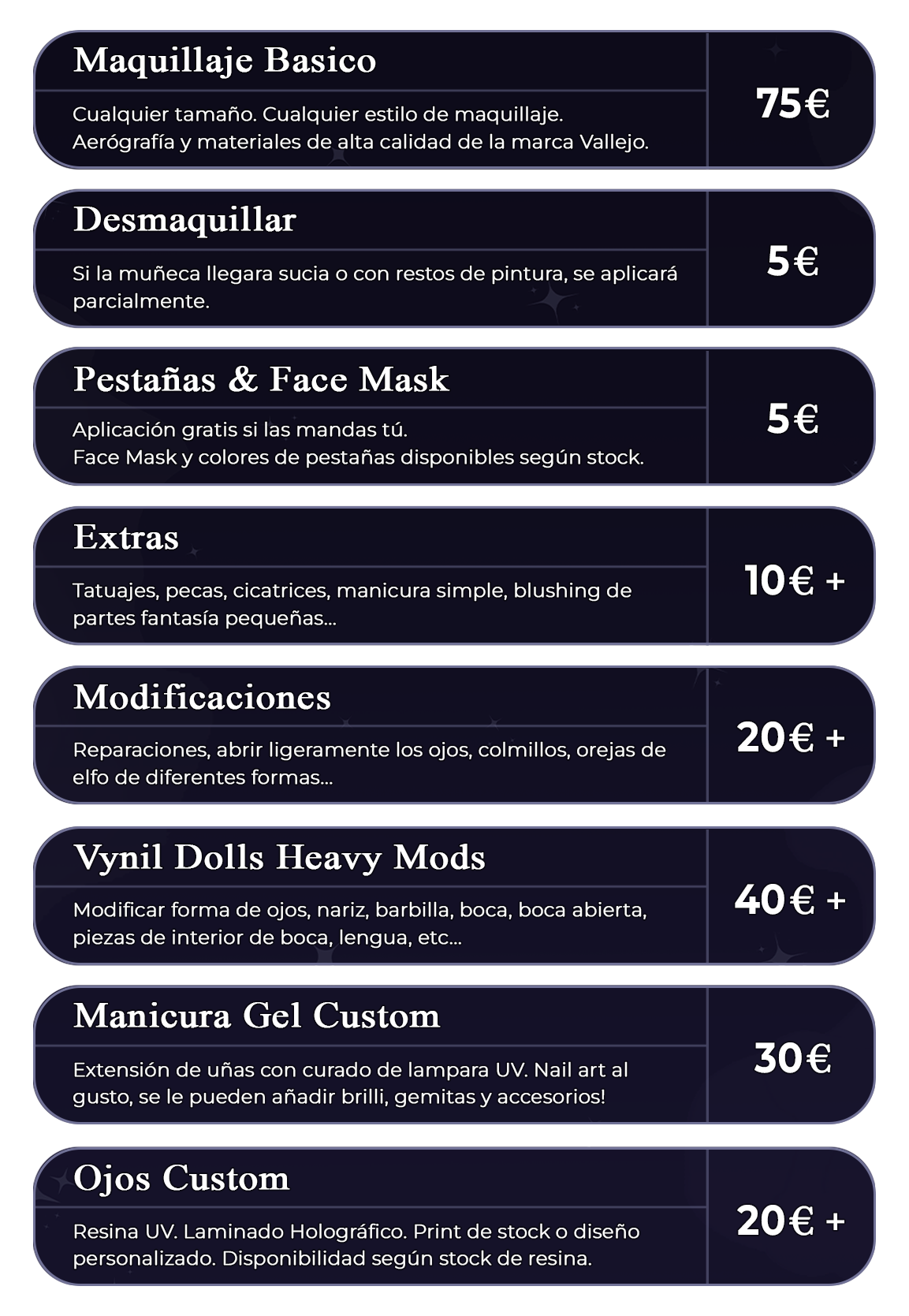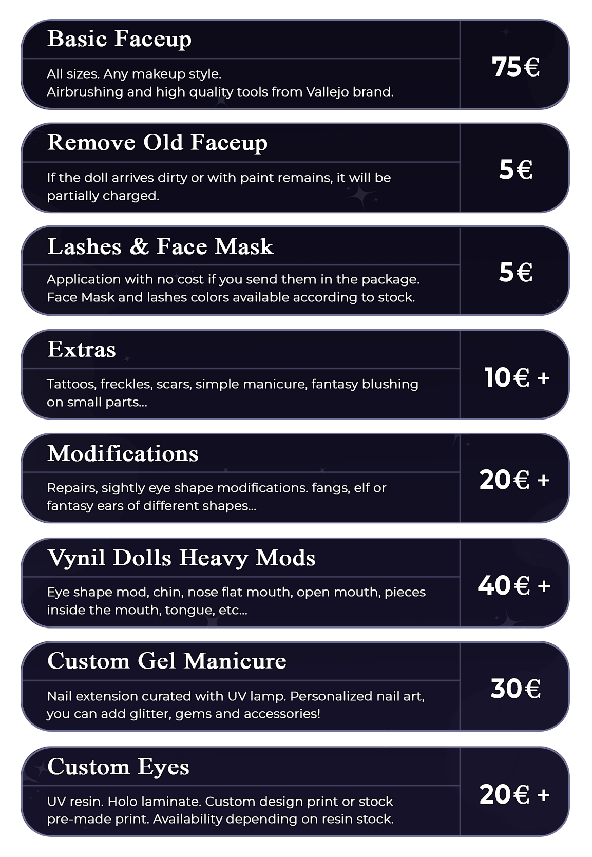 You can ask me any questions or for an approximate budget without commitment before signing up through my social networks or my email at any time if you need itI will accept to work on faceups, blushings, perforations for earrings, repairs and modifications on BJDs of any size, Dollfie Dreams and other types of vinyl dolls, BJD Pets, Dragones Plapico and similar dolls. At this moment I don't paint Monster Highs, Fashion Dolls or that style of dolls.There will be around 4 comission slots. I will open the faceup slots on my instagram page in advance once I finish the pending orders. I will give the slots in order of arrival.To make an order, you just have to send me an email to [email protected] or a private message on Magic Owl Forest instagram page when I announce that my commissions are open, briefly telling me what the commission will be like and how many dolls you want to send me.When you reserve your commission slot, I will ask you all the details so I can receive the necessary information to be able to start working on your doll, I will give you the total budget, of which you must pay 50% in advance to confirm your commission, after this I will provide you with my address so you can send me the head or the doll that I have to work on... And that's it!Below you will find a list of approximate prices and the terms of service. If you place an custom order with me, I assume that you have read the following rules and that you agree with them and with everything explained next.